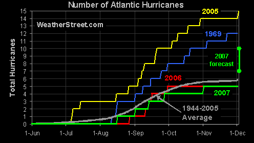 Este gráfico de las tormentas registradas en el Atlántico nos dice que el asunto parece ser al revés: después de las apocalípticas predicciones que si hicieron a consecuencia del huracán Katrina de 2005, de que los huracanes aumentarían su número, frecuencia y potencia, las dos temporadas siguientes -2006 y 2007- fueron decepcionantes para Al Gore y sus amigos alarmistas: En esas temporadas apenas se registraron 5 huracanes de categoría 1 y mayores.