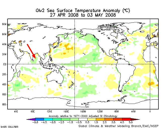 Vemos que el ciclón se formó al Noreste de Sri Lanka, en una zona del mar Índico que se identifica en el mapa que sigue abajo, con un color verde claro, mostrado por una flecha roja. Este mapa corres-ponde a las temperaturas que había sobre los océanos del mundo entre el 27 de abril y el 3 de mayo de 2008, durante la formación y desarrollo del Nargis. El color verde claro corresponde a una anomalía de disminución de la temperatura del mar. El mar estaba más frío que lo normal!