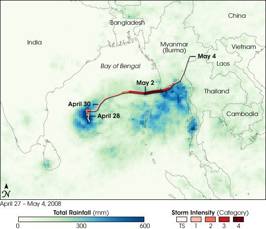 A continuación nos fijamos en el mapa que el Earth Observatory de la NASA nos proporciona sobre el lugar de formación del ciclón Nargis y la ruta que siguió hasta Myanmar. Se formó al este de la costa de la India el 28 de abril pasado, y entre el 2 y el 3 de mayo tocó la costa como categoría 4, bajando de inmediato a 3, 2, 1, terminando como tormenta tropical a fines del 3 de mayo.