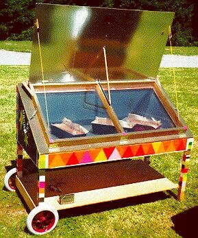 Ce four de construction très simple permet d’atteindre des températures supérieures à 100°C et de cuire beaucoup d’aliments. (une caisse en bois, du sable comme isolant, un bac de cuisson en papier d’aluminium et un couvercle en verre).