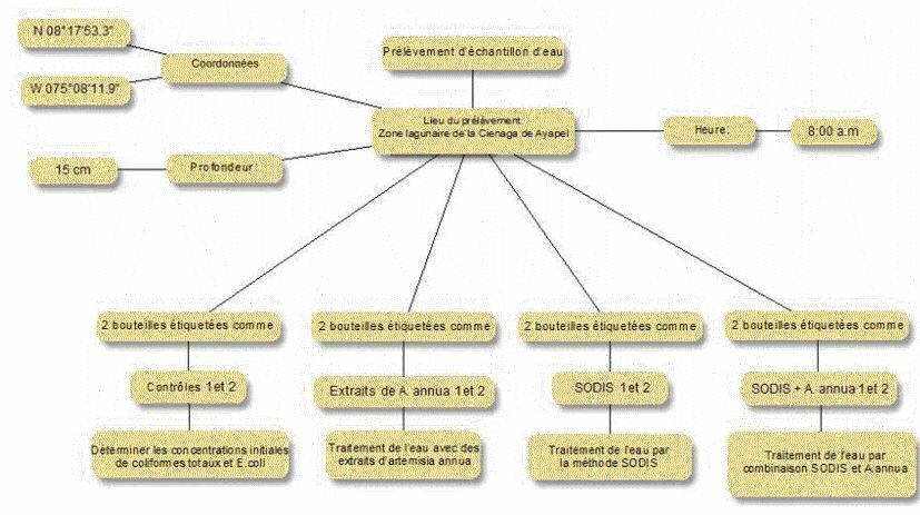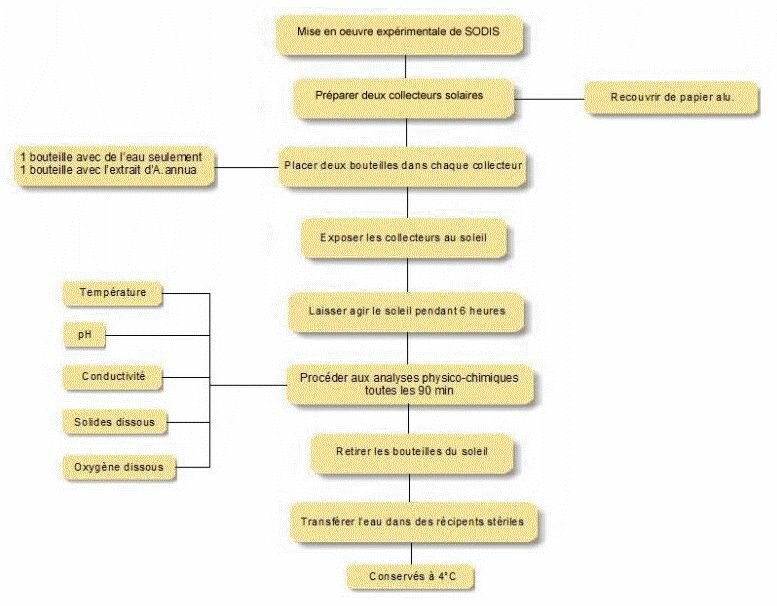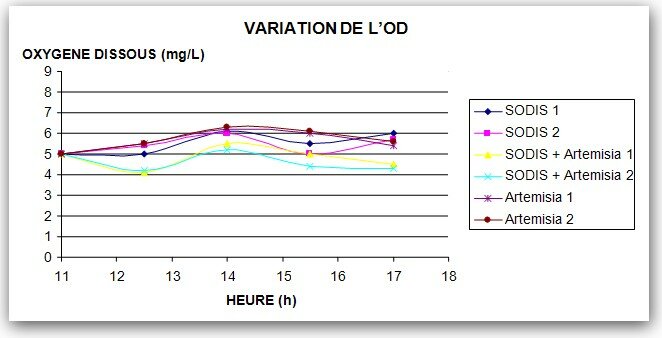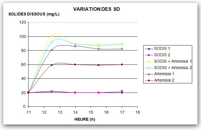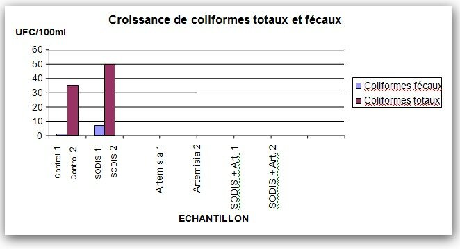 L'efficacité de la désinfection de l'eau par la méthode SODIS ou par des extraits d'artemisia a pu être démontrée. La combinaison des deux méthodes garantit un résultat acceptable par périodes nuageuses. A remarquer également que dans le cas de ce travail l'efficacité de la tisane d'artemisia annua était obtenue par simple filtration de l'eau contaminée à travers une couche d'herbe sèche posée sur tamis.