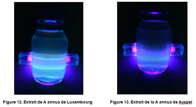 Afin de déterminer si les deux échantillons d'Artemisia annua, l'un en provenance de Luxembourg, l'autre de Ayapel étaient equivalents on a soumis l'extrait de chacune des plantes au test de la fluorescence. L'échantillon de Luxembourg presente en effet une fluorescence nette quand il est mis sous lumière UV à 365 nm (Lutgen 2008).
