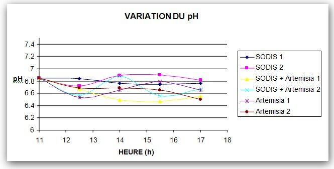 Le pH oscillait entre 6.50 et 6.84. Aucun traitement n'entraînait donc une variation significative du pH qui l'aurait rendue impropre à la consommation humaine (pH requis de 6.5 à 9.0)