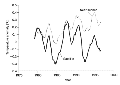 Satellite measurements of the temperature of the lower troposphere between 1979 and 1997 (30,000 readings per day over 95 percent of the Earth´s surface), reveal a slight cooling trend of -0.04°C per decade. Changes of average global temperatu-re of Earth´s atmosphere are show here from the satellite measurements in the lower troposphere (solid line), and near surface measurements over land and sea (dotted line).