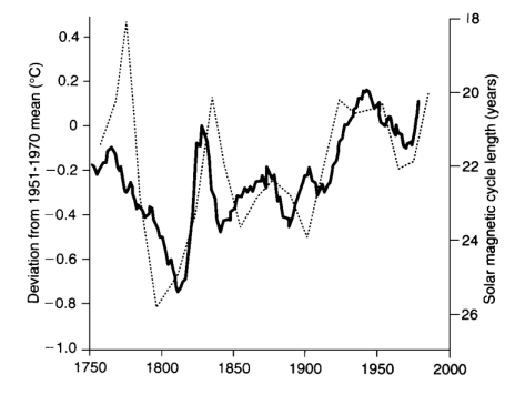 The shorter the magnetic cycle, the more active, and hence brighter, the Sun. During the paste several hundred years, terrestrial temperature has fluctuated in step with solar brightness, as would be expected. Moving 11-year average of terrestrial Northern Hemisphere temperatures, as deviations from the 1951-1970 mean, are shown by the heavy line. The length of the solar magnetic cycle is shown in the thin dotted lines.