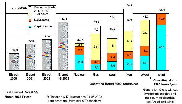 Un detallado estudio de economía energética en Finlandia publicado a mediados del 2000, muestra que la energía nuclear sería la opción de menor costo para una nueva capacidad de generación. El estudio comparó la energía nuclear, al carbón, turbinas de gas de ciclo combinado y turba. Las centrales nucleares tienen costos de capital mucho más elevados que las otras --EUR 1749/kW incluyendo la carga inicial de combustible, que es tres veces el costo de las plantas de gas. Pero sus costos de combustible son mucho más bajos, de modo que a factores de capacidad por encima del 64% es la opción más barata.