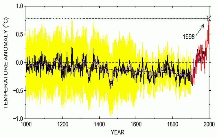 Ese gráfico apareció repetidamente en el Tercer Informe de Evaluación del Panel Intergubernamental sobre el Cambio Climático (IPCC) (2001) y en los informes de los medios de comunicación de todo el mundo.
