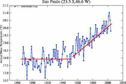 Se ha demostrado que las temperaturas nocturnas registradas en muchas estaciones han sido elevadas artificialmente por la expulsión de calor radiante recogido y almacenado durante el día por estructuras de concreto y ladrillo como casas, edificios, caminos, y también automóviles. Dado que el área terrestre de pueblos y grandes ciudades que tienen a estas estaciones meteorológicas comprende sólo una pequeña parte del área total de la región, esta influencia sobre la temperatura global se combina para formar un promedio, estas temperaturas nocturnas elevadas artificialmente distorsionan a la información promedio. Cuando se miran sólo a las temperaturas diarias de las grandes ciudades el “drástico calentamiento global” no se hace visible. (Esto también se puede ver cuando se miran a la información de las estaciones rurales que son más indicativas del verdadero clima de esa región.)