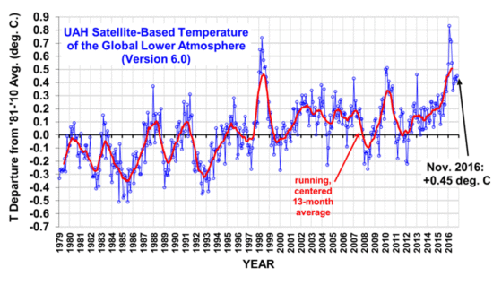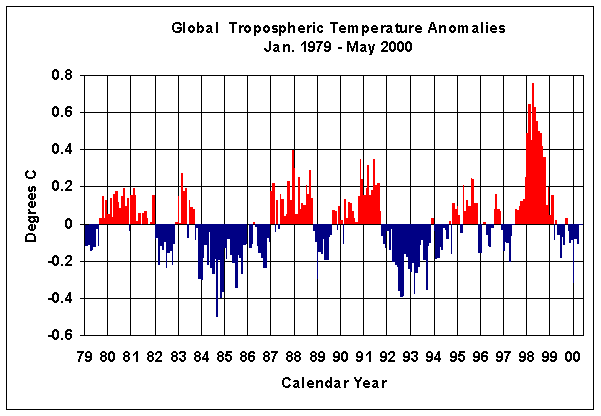 A diferencia de las temperaturas de superficie, las mediciones de las temperaturas globales de la baja atmósfera obtenida por los satélites revelan la inexistencia de una tendencia al calentamiento durante las dos décadas pasadas. La ligera tendencia que hay en la información en realidad aparece como hacia abajo. Las grandes fluctuaciones en las temperaturas de los satélites no son causadas por ninguna actividad humana sino de fenómenos naturales, por ejemplo las grandes erupciones volcánicas como la del Pinatubo y por El Niño. De manera que los programas que modelan al calentamiento global en una computadora dicen que la temperatura de la atmósfera baja de la Tierra debería de estar subiendo de manera marcada, pero las reales mediciones de la temperatura de la atmósfera baja no revelan ninguna actividad tan pronunciada.
