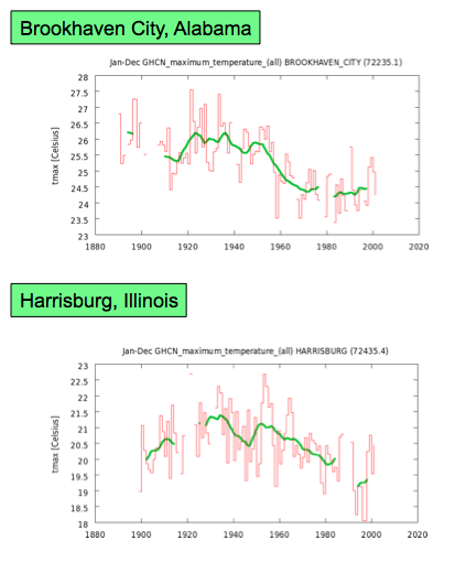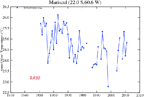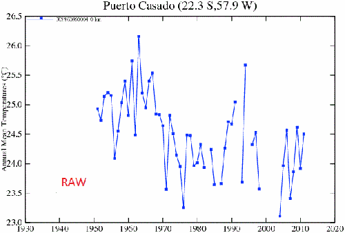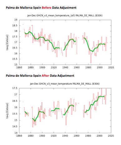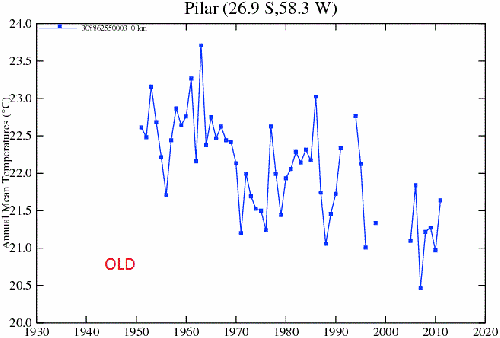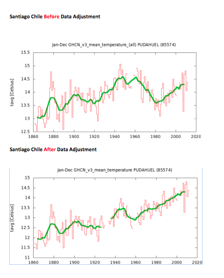 Durante los primeros años de mi investigación me basé en los bancos de datos climáticos de NASA y GISS, dos de los cuerpos científicos más prestigiosos de nuestro país. Después de muchos años de minuciosa recolección de datos, y de incansable representación gráfica de esos datos, descubrí que no estaba mirando a la información recogida originalmente, sino a información que había sido “ajustada” por lo que serían “razones científicas”. La información original ya no está disponible en esos bancos de datos. Afortunadamente fui capaz de obtener la información original de esas estaciones de unas 7000 estaciones meteorológicas del mundo en la base de datos de KNMI (Royal Dutch Meteorological Institute). Allí pude revisar ambas informaciones, la antigua sin ajustes y la “ajustada”, así como el desglose de los datos diurnos y nocturnos. Los resultados fueron asombrosos. Descubrí que la información de muchas estaciones en el mundo había sido “ajustada” de manera sistemática para hacerla aparecer como apoyando la afirmación de que el calentamiento global estaba ocurriendo cuando, de hecho, en muchos lugares del mundo estaba sucediendo lo contrario.A continuación presentaré unos pocos de los miles de ejemplos de este ajuste de datos. Cuando hago presentaciones de mi material en universidades y colegios locales, estos gráficos son los que tienen el mayor impacto afectando la opinión de los estudiantes, especialmente cuando se da cuenta de que existe un esfuerzo concentrado de falsificar lo que está ocurriendo en la realidad. Otro resultado impactante es cuando se hacen gráficos de las máximas diurnas del país, surge una imagen muy diferente de la información histórica de la temperatura.